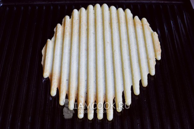 Электрический гриль хорошо разогреть, панели слегка смазать растительным маслом. Выложить 1 ст.л. с верхом теста, сомкнуть панели и прижать. Выпечь вафлю на электрогриле до готовности.