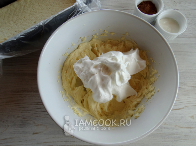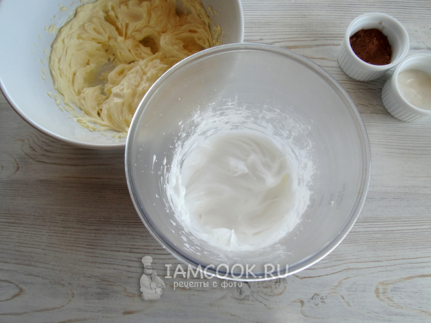 Белки взбить до мягких пиков, затем всыпать сахар и хорошенько взбить, чтобы сахар растворился, а белки стали ещё устойчивее.