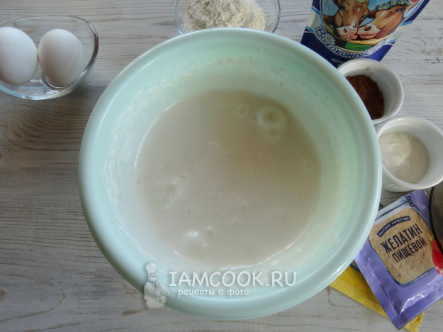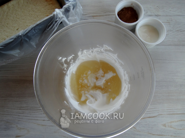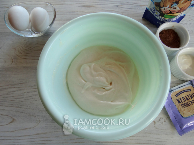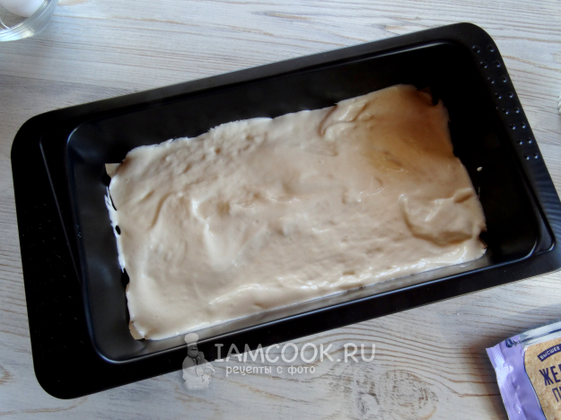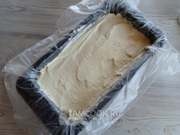 Переложить будущее суфле на бисквит и разровнять. Прикрыть пленкой и убрать в холодильник на 2 часа, или пока суфле не стабилизируется.