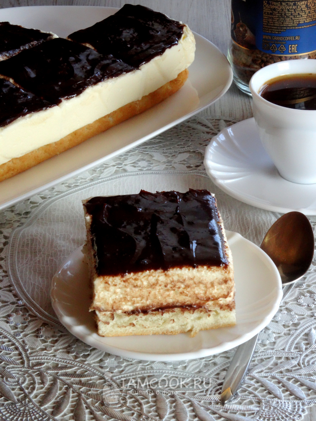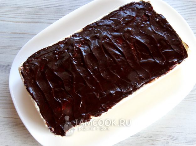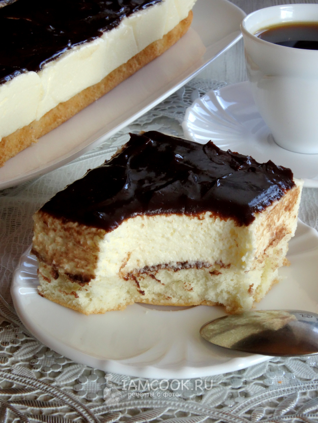 Бисквит с суфле достать из формы, переложить на тарелку, покрыть глазурью, а затем нарезать острым ножом на прямоугольники или квадраты, как нравится.