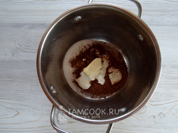 В кастрюльке смешать масло, сахар, сметану и какао.