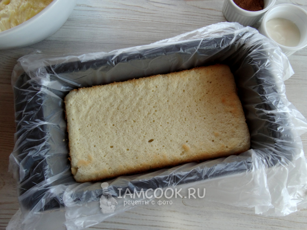 Эту же форму, в которой выпекался бисквит, застелить плёнкой. Положить на дно бисквит.