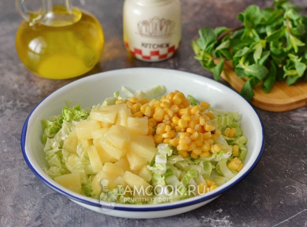 Слейте жидкость с кукурузы и ананаса и добавьте их к пекинской капусте.