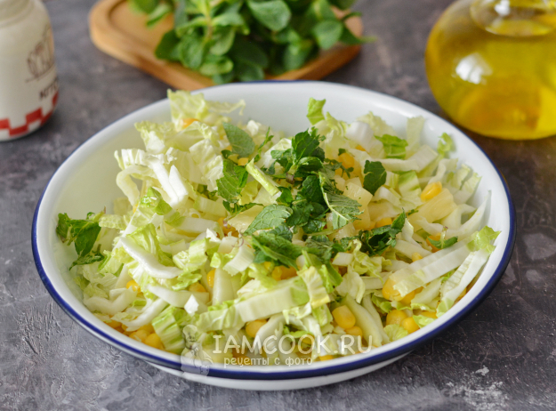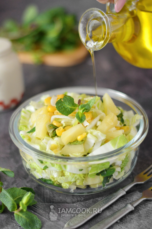 Быстрый и свежий салат из пекинской капусты с ананасом и кукурузой готов за считанные минуты.