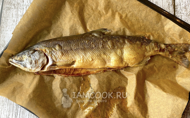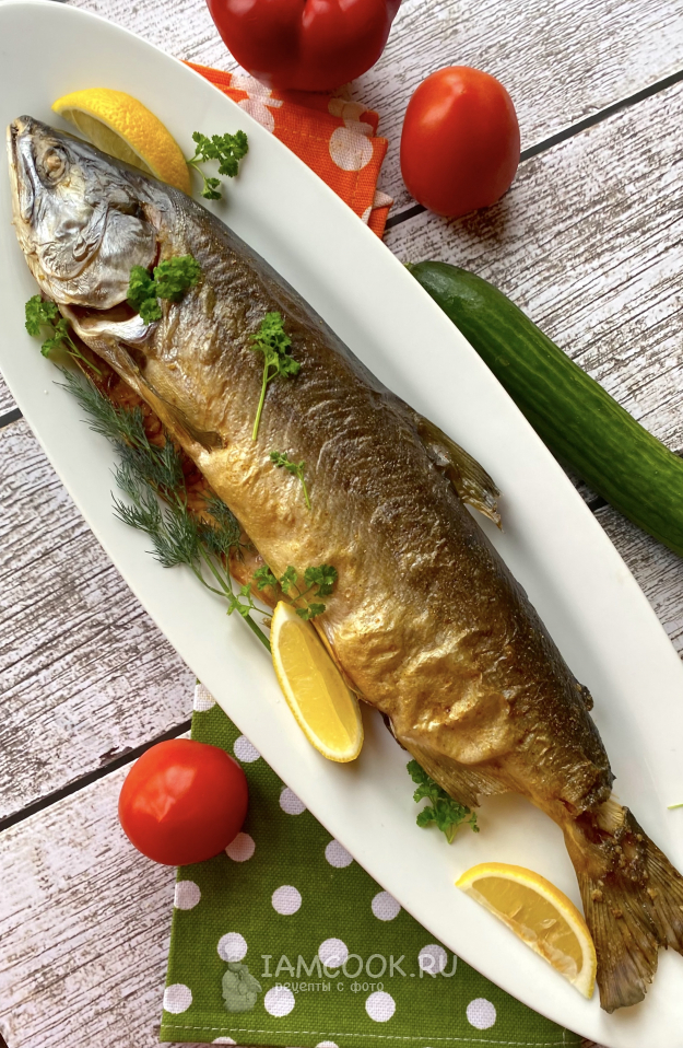 Вкусная, ароматная горбуша, запеченная в духовке целиком, готова к подаче на стол.