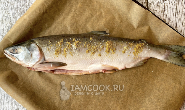 Натрите рыбу маслом и соком лимона со всех сторон. Посыпьте специями, солью и перцем и хорошенько натрите.