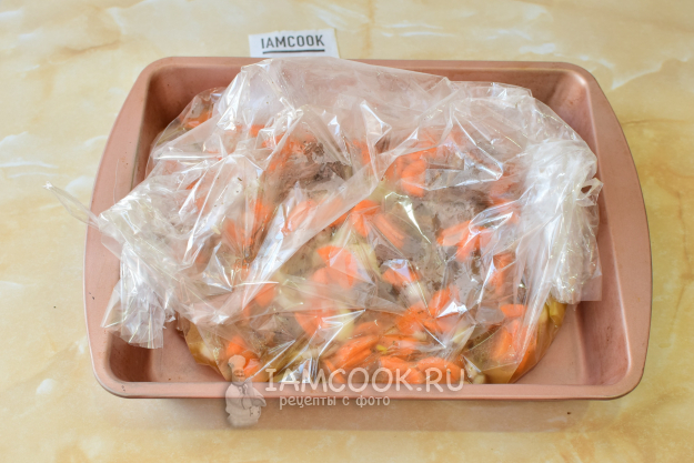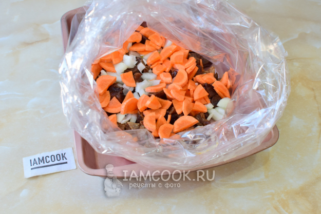 Лук и морковь очистите, нарежьте и разложите в рукаве по мясу.