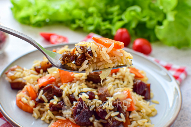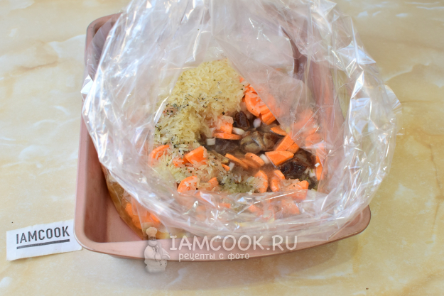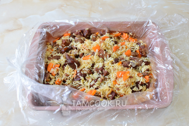 Завяжите рукав с другой стороны. Немного все помешайте. Поставьте в духовку, предварительно разогретую до 180 градусов, и готовьте плов из баранины в рукаве примерно 40 минут. Ориентируйтесь по степени готовности риса.