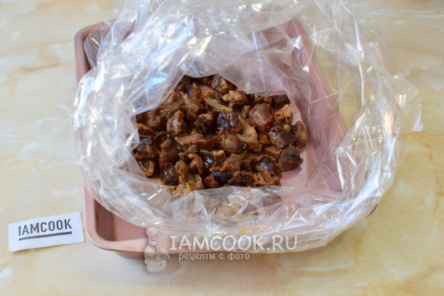 Пакет для запекания завяжите с одной стороны. Выложите в него баранину и бульон, в котором она тушилась.