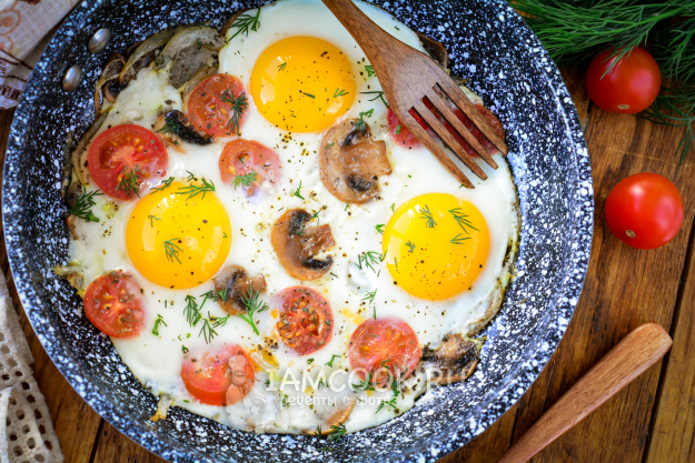 Готовую яичницу с грибами и помидорами сразу подавайте к столу. Блюдо сытное и очень вкусное!
