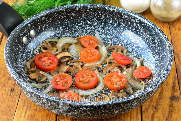 Добавьте в сковороду нарезанные помидоры, добавьте немного сушеного базилика для аромата.