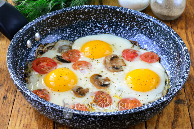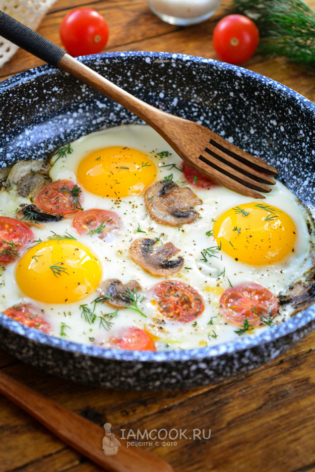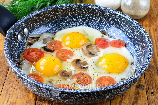 Соберите все продукты для приготовления яичницы с грибами и помидорами на сковороде.