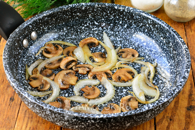 Разогрейте немного растительного масла на сковороде, выложите туда нарезанный репчатый лук и шампиньоны. Жарьте грибы с луком 3-4 минуты, помешивая. Посолите по вкусу.