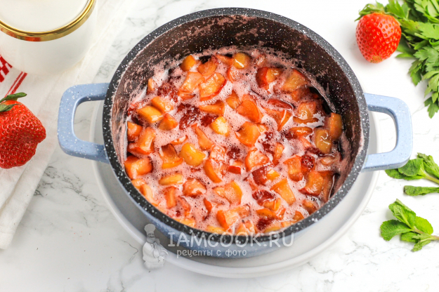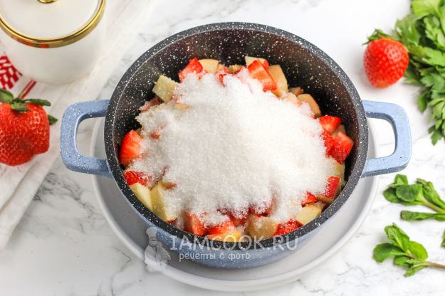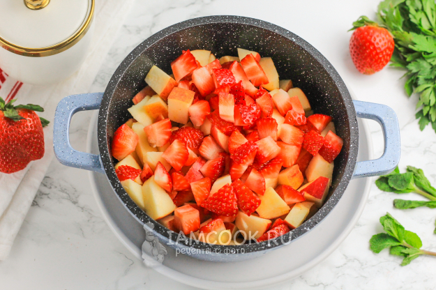 Всыпьте яблоки в казан или кастрюлю с антипригарным дном. Промойте ягоды клубники, срежьте хвостики и нарежьте кубиками чуть меньшего размера.
