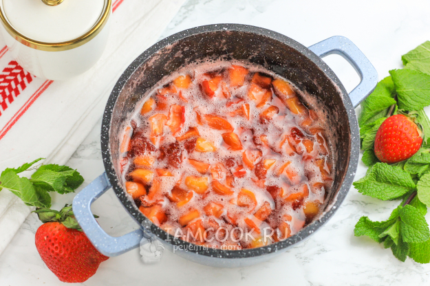 Затем снова поместите емкость на плиту и доведите до кипения. Отварите еще 5-10 минут. За это время объем варенья уменьшится на треть. Ошпарьте банку и крышку кипятком либо простерилизуйте любым другим образом.