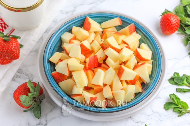 Яблоки промойте в воде, разрежьте на четыре части и вырежьте семенные блоки. Промойте и нарежьте средними кубиками или дольками.