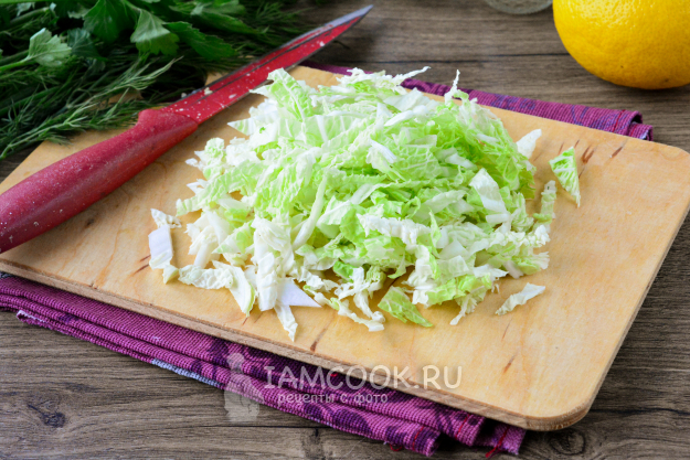 Пекинскую капусту тонко нашинкуйте. Капуста получается легкой и воздушной.