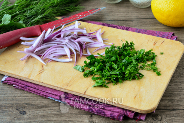 Красный лук почистите и нарежьте полукольцами. Зелень сполосните и высушите, мелко нарежьте. Для салата отлично подходят укроп и петрушка.