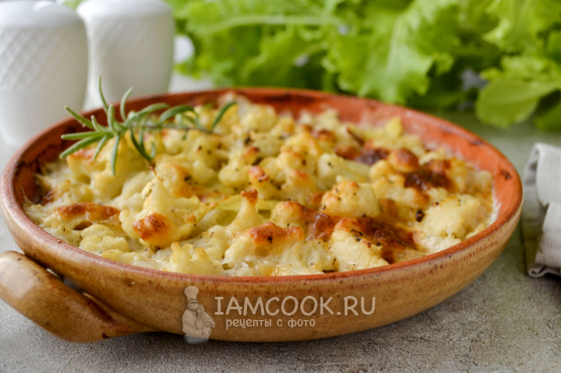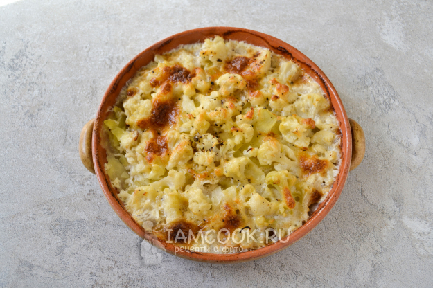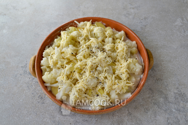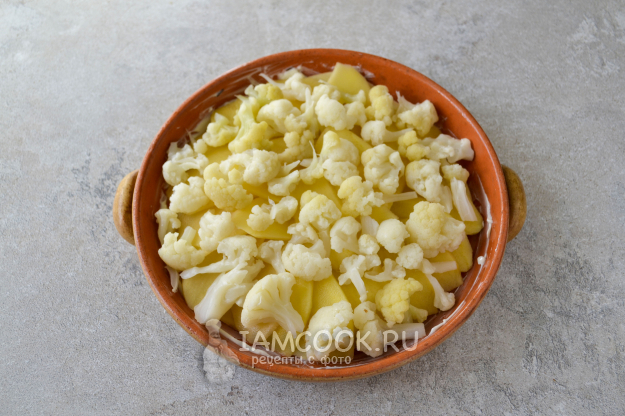 На картошку равномерно разложите цветную капусту, разобранную на мелкие соцветия.