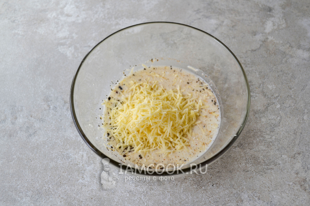 Для заливки соедините молоко или сливки, добавьте натертый твердый сыр, соль, черный молотый перец и мускатный орех. Перемешайте.
