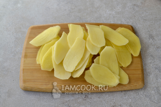 Картошку почистите и нарежьте тонкими слайсами от руки или на специальной терке.