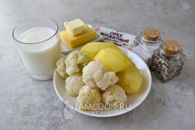 Соберите по списку продукты для приготовления картофельного гратена с цветной капустой. Капусту можно использовать как свежую, так и замороженную. Из специй я взяла черный молотый перец и мускатный орех.