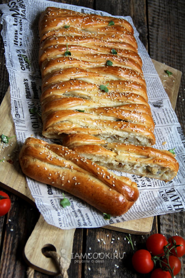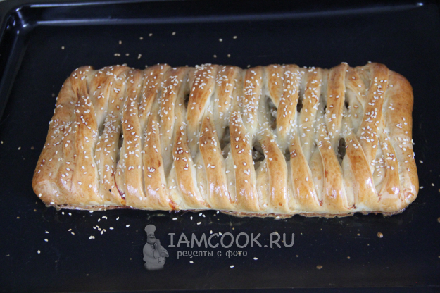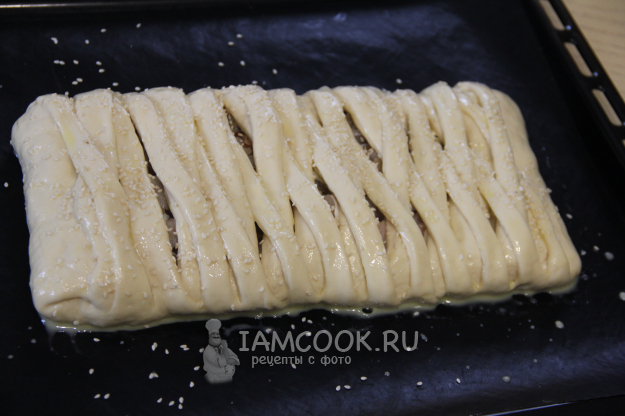 Готовый пирог оставить на кухонном столе на 30 минут. Затем смазать пирог взбитым желтком и присыпать кунжутом.