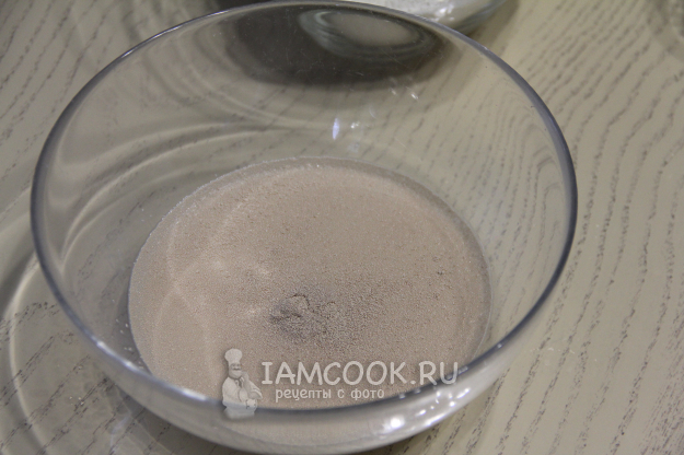 В теплое молоко (38 градусов) всыпать сахар и дрожжи. Перемешать массу и оставить на 5 минут.