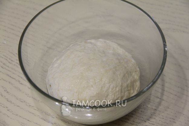 Колобок теста выложить в миску, смазанную маслом. Накрыть тесто пленкой и поставить миску с тестом в теплое место на 1,5 часа.