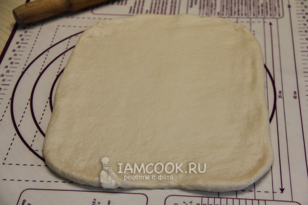 Пласт теста выложить на коврик для выпекания. Выложить начинку и разровнять.
