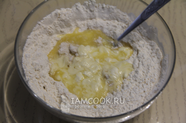 Затем всыпать просеянную муку и соль, перемешать массу ложкой.