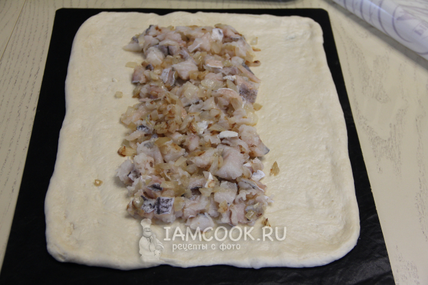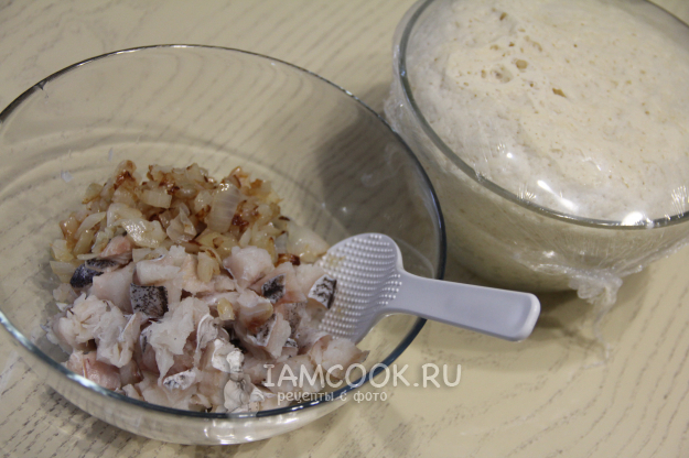 Филе пикши нарезать на кусочки 1x1 см. В миске соединить нарезанную пикшу, жаренный лук. Посолить по вкусу и перемешать начинку.