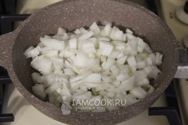 В сковороду влить масло и добавить мелко нарезанный лук. Луковицу взять большую или две средние.