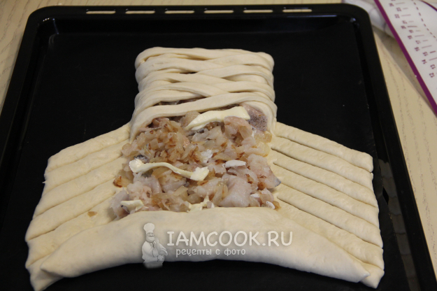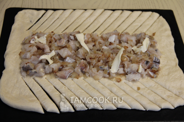 Оставшиеся пустые края теста нарезать на полоски шириной 1,5 см. Поверх рыбной начинки выложить кусочки масла.
