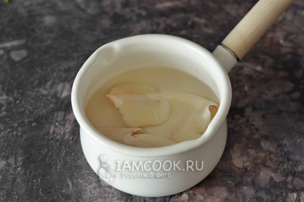 Для этого полностью размороженных кальмаров очистите от внутренностей и плёнок, удалите хитиновый скелет. Опустите тушки кальмаров в слегка подсоленный кипяток и варите до готовности примерно 1 минуту. Снимите с огня и полностью остудите.