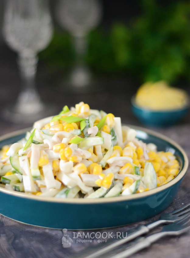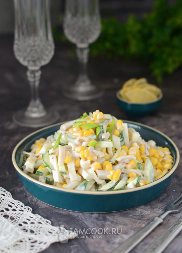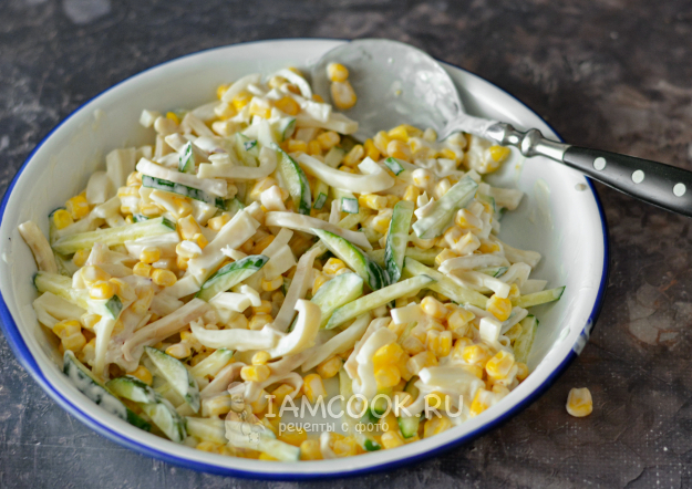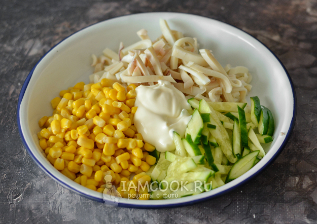 Соедините в миске кальмаров, огурцы и кукурузу (слив с неё предварительно жидкость). Добавьте майонез по вкусу.