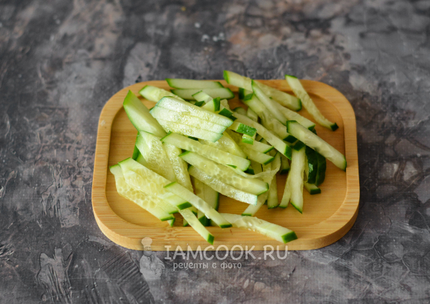 Также короткой соломкой нарежьте свежий огурец.