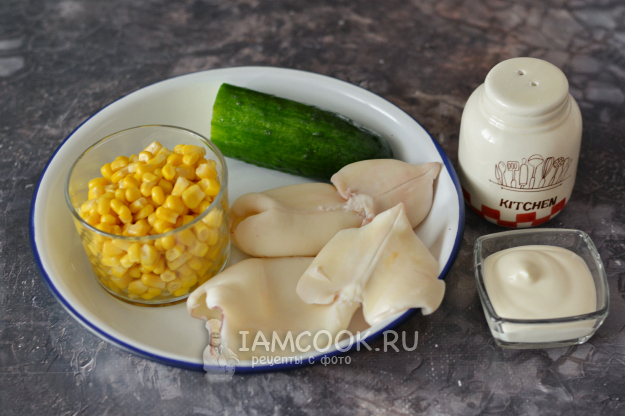 Подготовьте необходимые продукты для салата с кальмарами, огурцом и кукурузой.