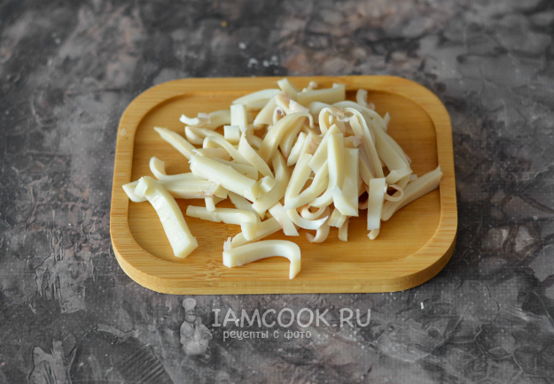 Варёных остывших кальмаров нарежьте короткой соломкой.