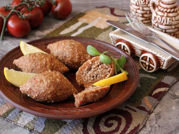 Ишли кюфту из говяжьего фарша с булгуром и грецкими орехами принято подавать с ломтиками лимона, чтобы поливать свежим ароматным соком.