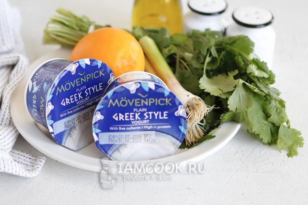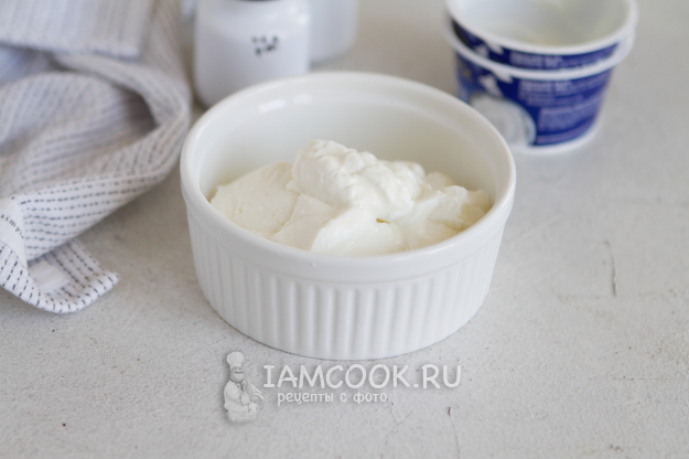 Могу допустить, что настоящий греческий йогурт не всегда можно найти в супермаркете. В таком случае возьмите обычный натуральный йогурт без добавок. Консистенция его будет отличаться от греческого йогурта, поэтому берите в 2 раза больше. Дальше застелите дуршлаг марлей в два слоя и выложите йогурт. Марлю собрать в пучок и подвесить. Йогурт должен повисеть 2-3 часа, а лишняя сыворотка - отойти от него. Такую процедуру рекомендую сделать заранее, чтобы к моменту заправки йогурт был уже готов.