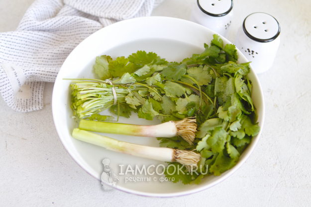 Первым делом займемся подготовкой зелени. Я добавляла в соус кинзу и молодой чеснок. Кинзу можно заменить на свежий укроп, для аромата также можно добавить листочки свежей мяты. Зелень необходимо хорошо промыть и обсушить.