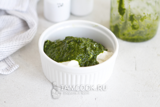 Добавляем в йогурт зеленую пасту из кинзы.