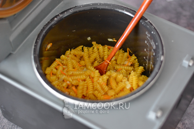 После того как лук с морковью обжарились, всыпьте в чашу мультиварки сухие макароны и обжарьте их "насухую" с луком и морковью около 1-2 минут.