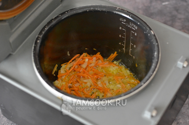 Очистите лук и морковь, нарежьте лук мелко, а морковь натрите на крупной тёрке. Включите мультиварку на нужную программу, и положите в чашу лук, морковь и снятый с тушенки жир. Обжаривайте лук с морковью до золотистого цвета около 10 минут. Обжаривать лучше с открытой крышкой мультиварки.
