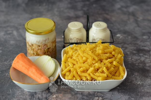 Соберите всё необходимое для приготовления макарон по-флотски с тушенкой в мультиварке.