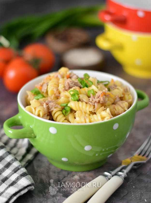 Влейте кипяток и посолите по вкусу. Перемешайте макароны с тушенкой и овощами.