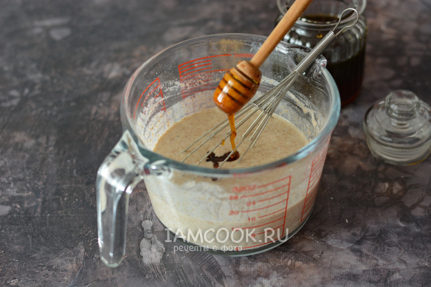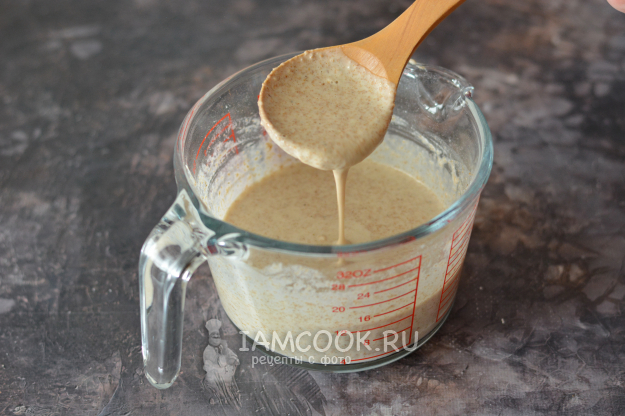 После того как тесто постояло, оно может стать гуще, поэтому размешайте его и сориентируйтесь по густоте. Оно должно быть довольно жидким, льющимся. Если тесто сильно загустело, то добавьте немного воды.