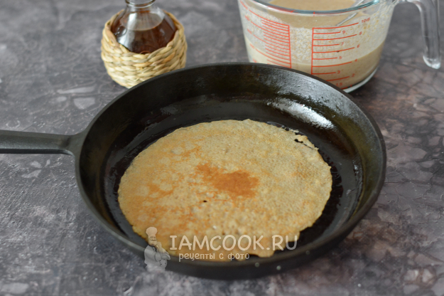 Нагрейте на среднем огне блинную сковороду. Обязательно смазывайте её маслом перед каждым блинчиком. Наливая небольшое количество теста, выпекайте цельнозерновые постные блинчики обычным способом по паре минут с каждой стороны.