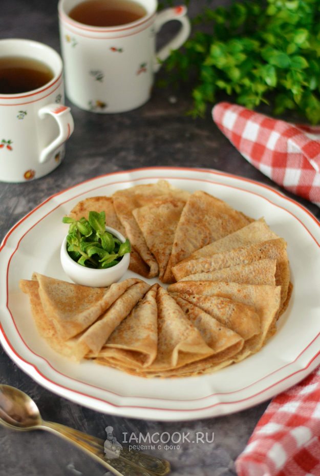 Готовые постные блины из цельнозерновой муки подавайте к столу тёплыми, с мёдом или вареньем.